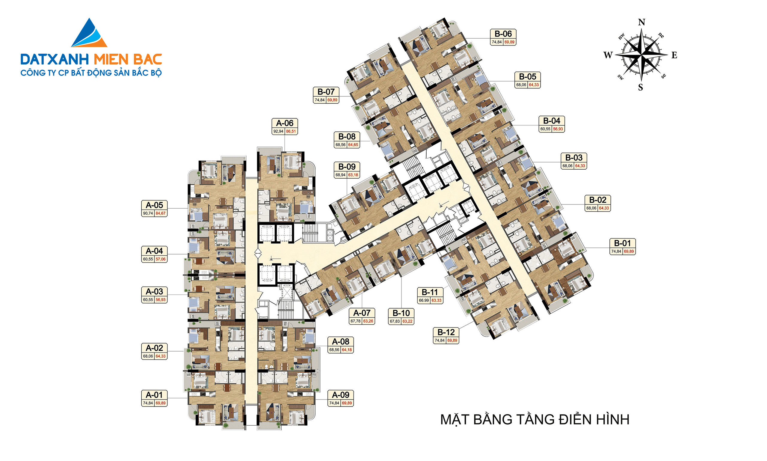 - Gồm:2 block A (9 căn hộ/tầng) và B (12 căn hộ/tầng)